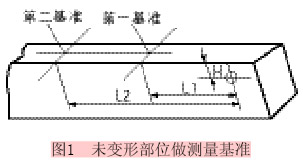 (1)先選取臂桿上未變形的部位做為基準(zhǔn),測(cè)量原座孔的位置,為防止出現(xiàn)大的誤差,選取2個(gè)基準(zhǔn)分別測(cè)量(見圖1),并將數(shù)據(jù)進(jìn)行比較分析,取接近的數(shù)據(jù);實(shí)際作法是挖掉變形部位,補(bǔ)上新板后,并在其基準(zhǔn)位置做好標(biāo)記。